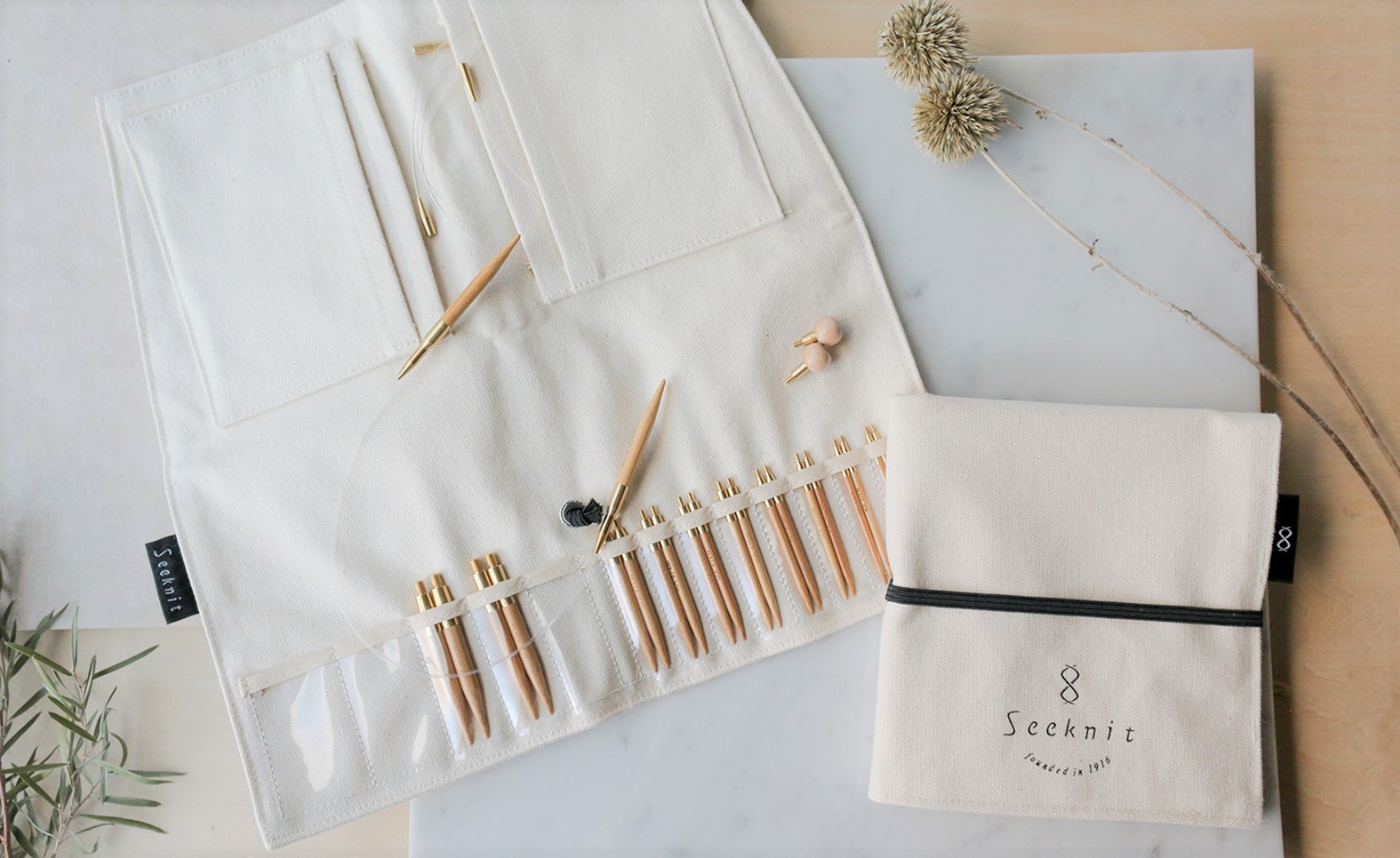 Our numbers of Bamboo Interchangeable Circular Needle Sets are available with a wide selection of needle lengths, sizes, and cable lengths, making many combinations possible. We have various sets in order to meet many different requests from knitters. All kinds of needle tips, cords, cord joints, stoppers and fabric cases are available individually (see IC Parts page).You can customize your original set by yourself as you like. The Seeknit brand offers two types of knitting needles, the Koshitsu line that has a brown tint and the Shirotake line that is the natural color of bamboo. All our circular needles feature a rotating swivel cord that prevents from twisting, so you can enjoy knitting comfortably.